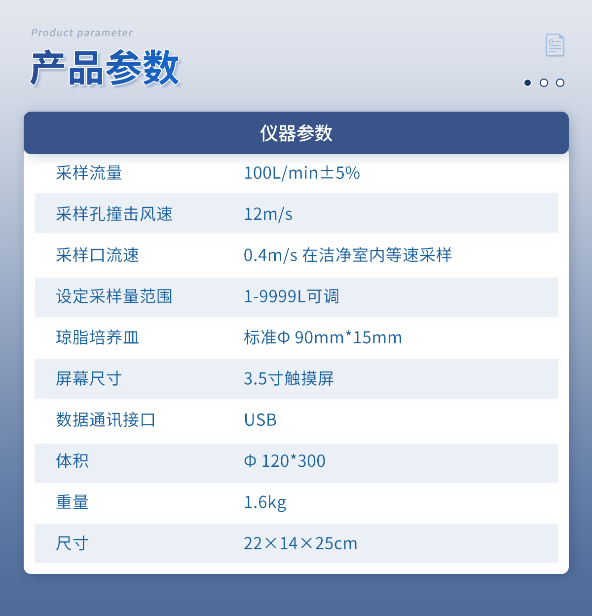 采樣流量:100L/min±5% 采樣孔撞擊風速:12m/s 采樣口流速:0.4m/s 在潔凈室內等速采樣 設定采樣量范圍:1-9999L可調 瓊脂培養皿:標準? 90mm*15mm 屏幕尺寸:3.5寸觸摸屏 數據通訊接口:USB 體積:Φ 120*300 重量:1.6kg 尺寸:22×14×25cm