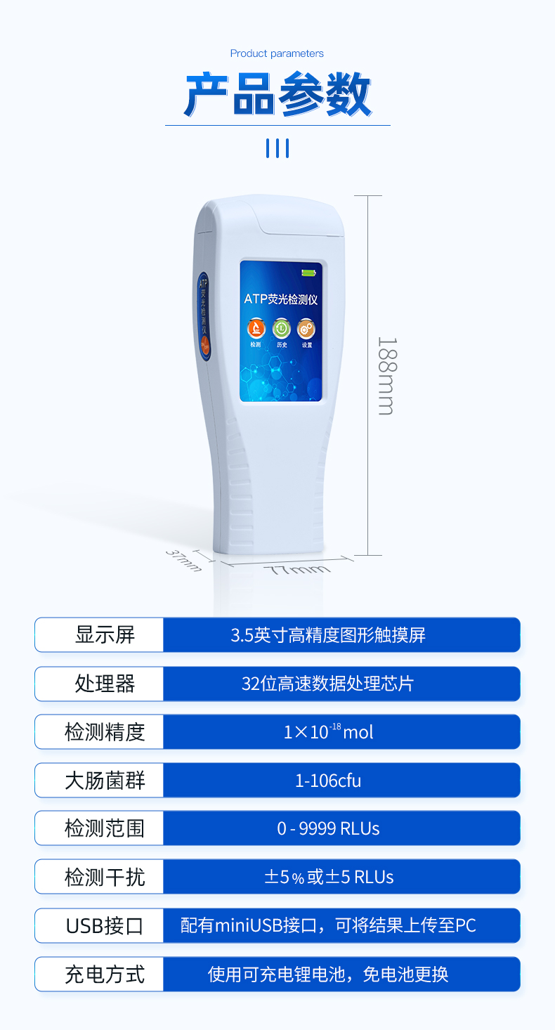 潔凈度儀器為全新升級產品,大屏幕觸摸顯示屏,代替傳統按鍵。操作采用生物化學反應方法檢測ATP含量,ATP熒光檢測儀基于螢火蟲發··· 熱線:133-7109-8225 二維碼