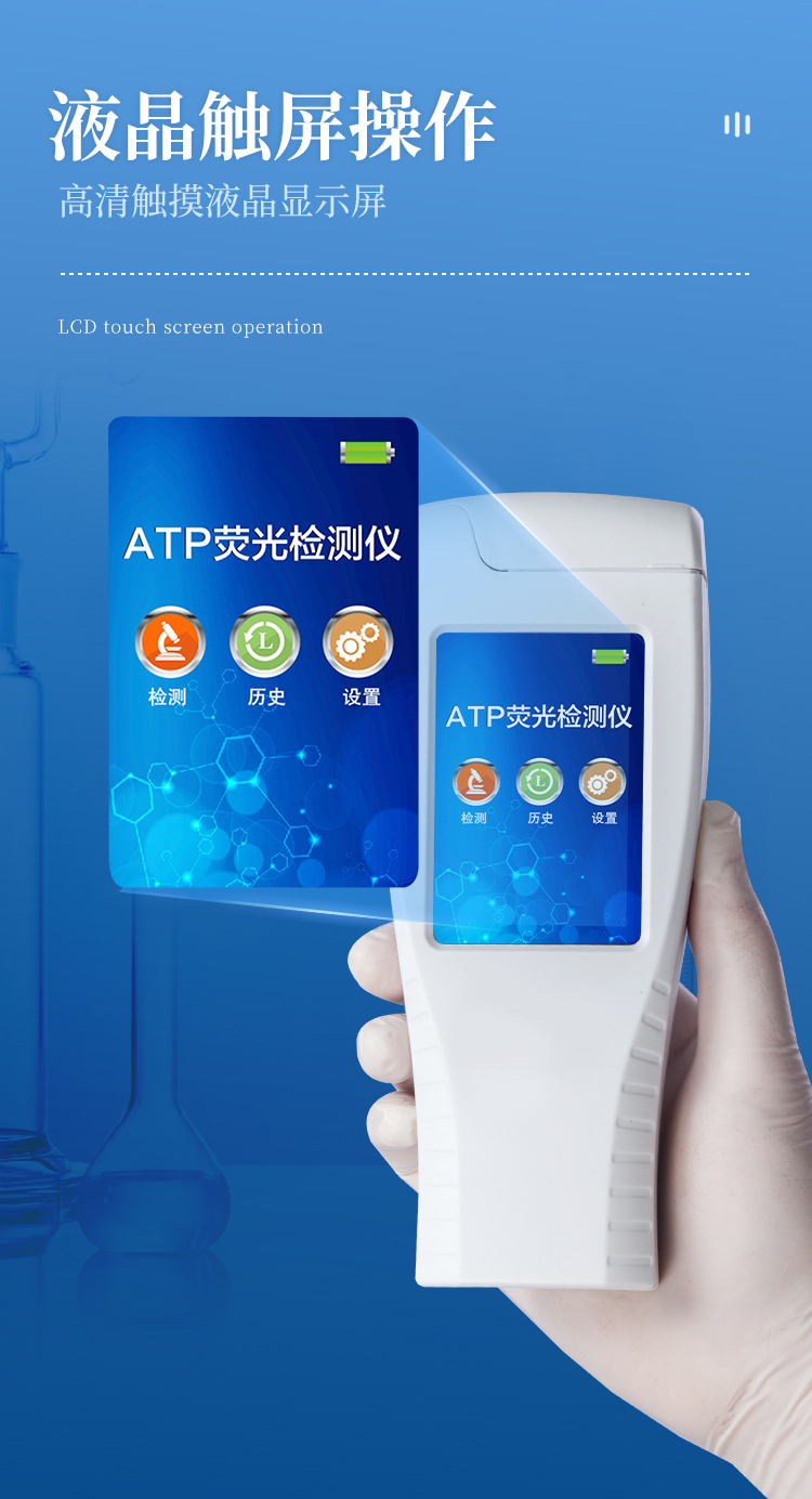 該設(shè)備為全新升級產(chǎn)品,大屏幕觸摸顯示屏,代替?zhèn)鹘y(tǒng)按鍵。操作采用生物化學(xué)反應(yīng)方法檢測ATP含量,ATP熒光檢測儀基于螢火蟲發(fā)光原理,利用“熒光素酶—熒光素體系”快速檢測三磷酸腺苷(ATP)。ATP拭子含有可以裂解細(xì)胞膜的試劑,能將細(xì)胞內(nèi)ATP釋放出來,與試劑中含有的特異性酶發(fā)生反應(yīng),產(chǎn)生光,再用熒光照度計檢測發(fā)光值,微生物的數(shù)量與發(fā)光值成正比,由于所有生物活細(xì)胞中含有恒量的ATP,所以ATP含量可以清晰地表明樣品中微生物與其他生物殘余的多少,用于判斷衛(wèi)生狀況。