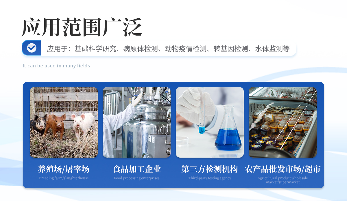 | 1、食品安全: 致病微生物、農獸藥殘留、生物毒素等快速篩查。 | 2、畜牧獸醫: 動物疫病診斷、動物源性安全指標檢測。 | 3、環境監測: 水質、土壤特定污染物篩查。 | 4、科研與生物安全: 免疫層析實驗定量分析、生物因子檢測。 | 5、其他領域: 所有使用膠體金免疫層析試紙條的場景。 |