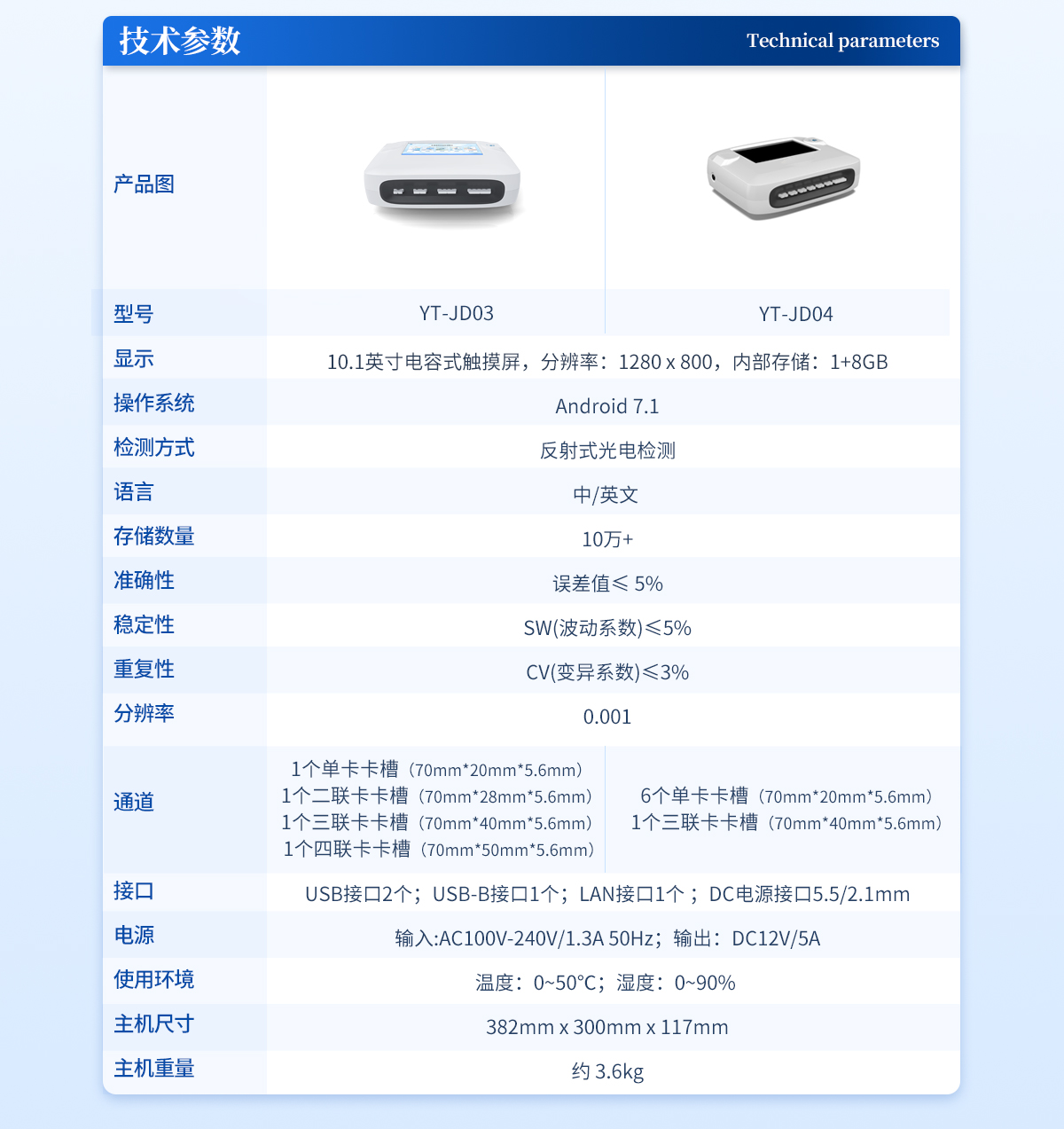 | 1、 屏幕:4.3英寸觸摸屏,分辨率:800*480,內部存儲:1+8GB | 2、 操作系統:Android:4.4 | 3、 檢測方式:反射式光電檢測 | 4、 適配卡殼:70mm*20mm | 5、 語言:中/英文: | 6、 存儲數量:10萬+ | 7、 準確性:誤差值≤:5% | 8、 穩定性:SW(波動系數)≤:5% | 9、 重復性:CV(變異系數)≤:3% | 10、 分辨率:0.001 | 11、 檢測通道:單通道 | 12、 檢測時間:<:5秒;可對樣本進行膠體金定性> | 13、 插卡判斷:檢測卡未插入檢測通道不能檢測 | 14、 數據傳輸:WiFi、藍牙、Type-C | 15、 數據處理:可通過通訊端口進行數據匯總、上傳監管平臺等 | 16、 檢測通道孵育檢測一體,溫度范圍::室溫:+5℃:~:60℃ | 17、 打印機:熱敏打印機(熱敏打印紙:57*20mm) | 18、 電源:輸入AC100V-240V/0.3A 50Hz;輸出DC5V/2A | 19、 電池容量:6000mah: | 20、 顯示電量 | 21、 使用環境:溫度:0~50℃;濕度:0~90%: | 22、 主機尺寸::206mm*85mm*60mm | 23、 主機重量:670g |