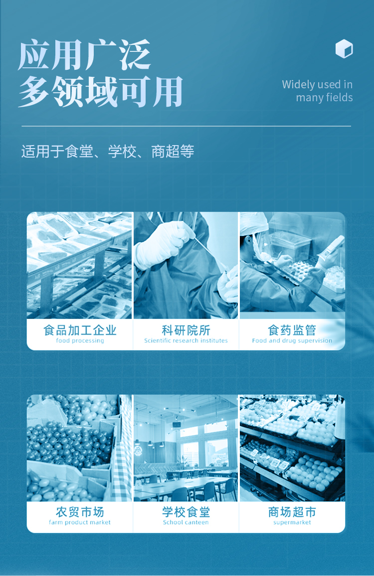 山東云唐智能科技有限公司生產的農藥殘留檢測儀廣泛應用于主要用于蔬菜、水果、茶葉、糧食、農副產品等食品中農藥殘留的快速檢測,依據國標GB/T5009.199-2003進行檢測,適用于果蔬茶生產基地以及農貿批發銷售市場現場檢測,餐館、學校、食堂、家庭果蔬加工前的安全速測等。