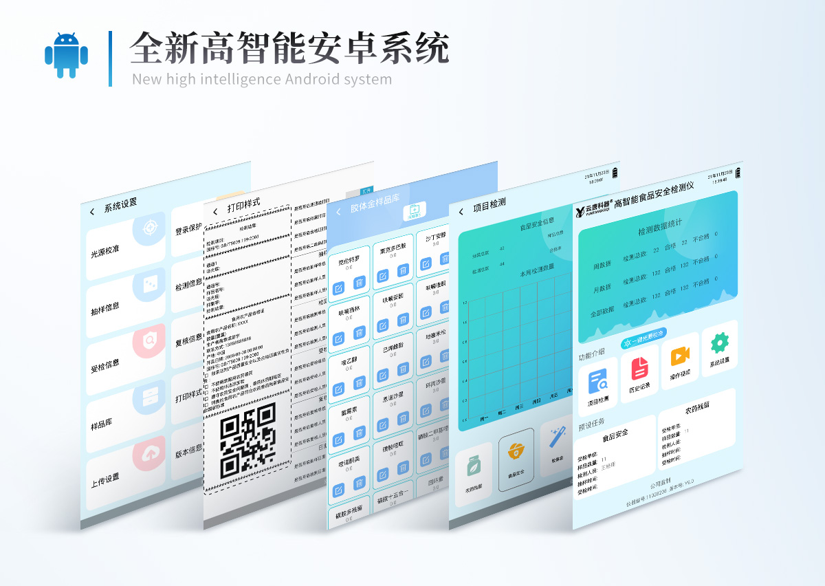 1、儀器采用手提式一體化系統檢測技術,將分光光度模塊、膠體金檢測模塊、新型農殘檢測模塊、數字化管理模塊、無線通訊模塊高度集成于一體,支持檢測200種食品安全檢測項目,同時預留升級檢測方法。