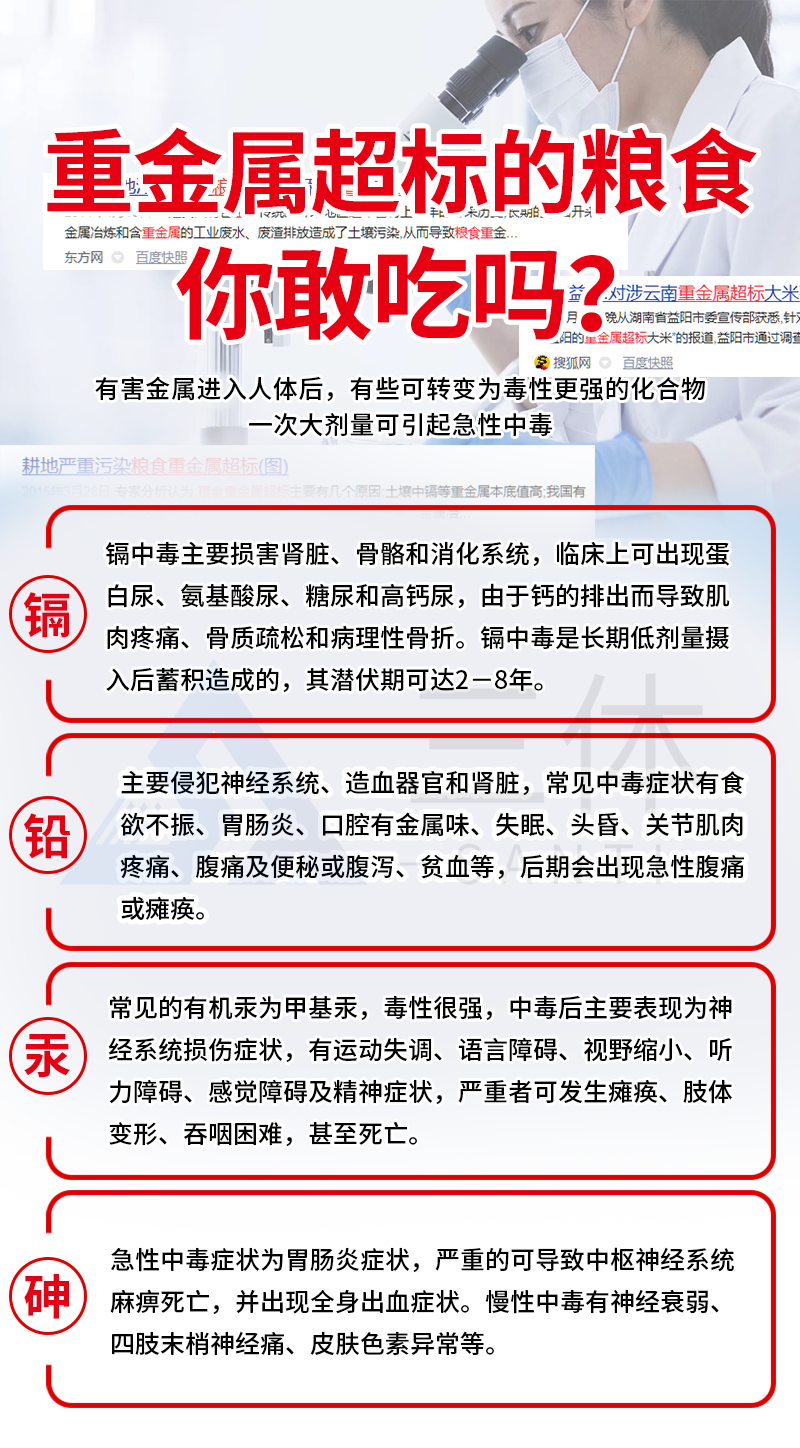 食品重金屬檢測設備廣泛應用于大米、糧谷、果品、蔬菜、藥材、水質、水產品中重金屬鉛、鎘、六價鉻、汞、砷、鐵、鎳、鋁的快速檢測,檢測項目可根據客戶的需求定制。