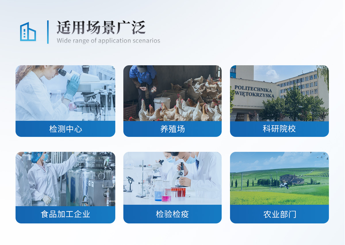 該儀器廣泛應(yīng)用于食藥監(jiān)局、衛(wèi)生監(jiān)督部門、農(nóng)業(yè)部門、商業(yè)系統(tǒng)養(yǎng)殖場(chǎng)、屠宰場(chǎng)、食品肉產(chǎn)品深加工企業(yè)、畜牧獸醫(yī)、檢驗(yàn)檢疫部門、食品生產(chǎn)企業(yè)、農(nóng)副產(chǎn)品批發(fā)市場(chǎng)、農(nóng)業(yè)生產(chǎn)基地、超市、餐廳、高教院校、食堂等單位部門對(duì)食品中的不安全指標(biāo)進(jìn)行監(jiān)測(cè)使用。