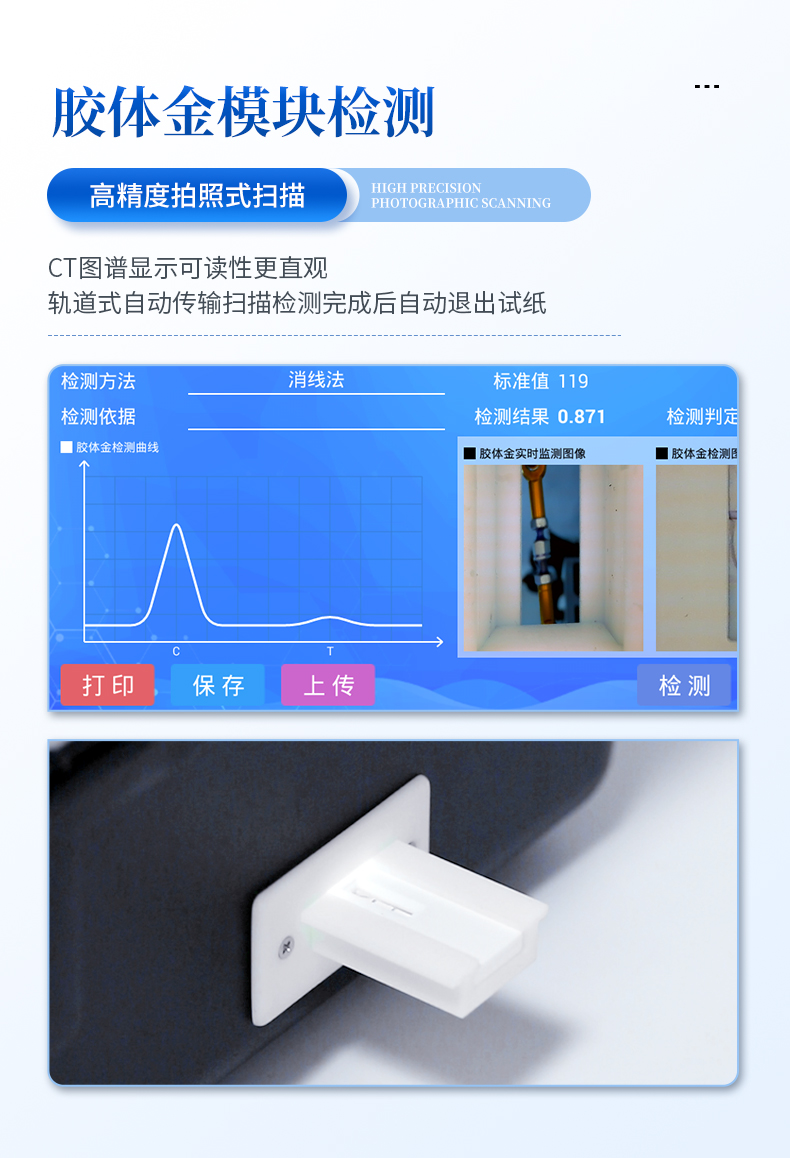 7、膠體金模塊檢測方式:軌道式自動傳輸掃描,檢測完成后自動退出檢測卡。
