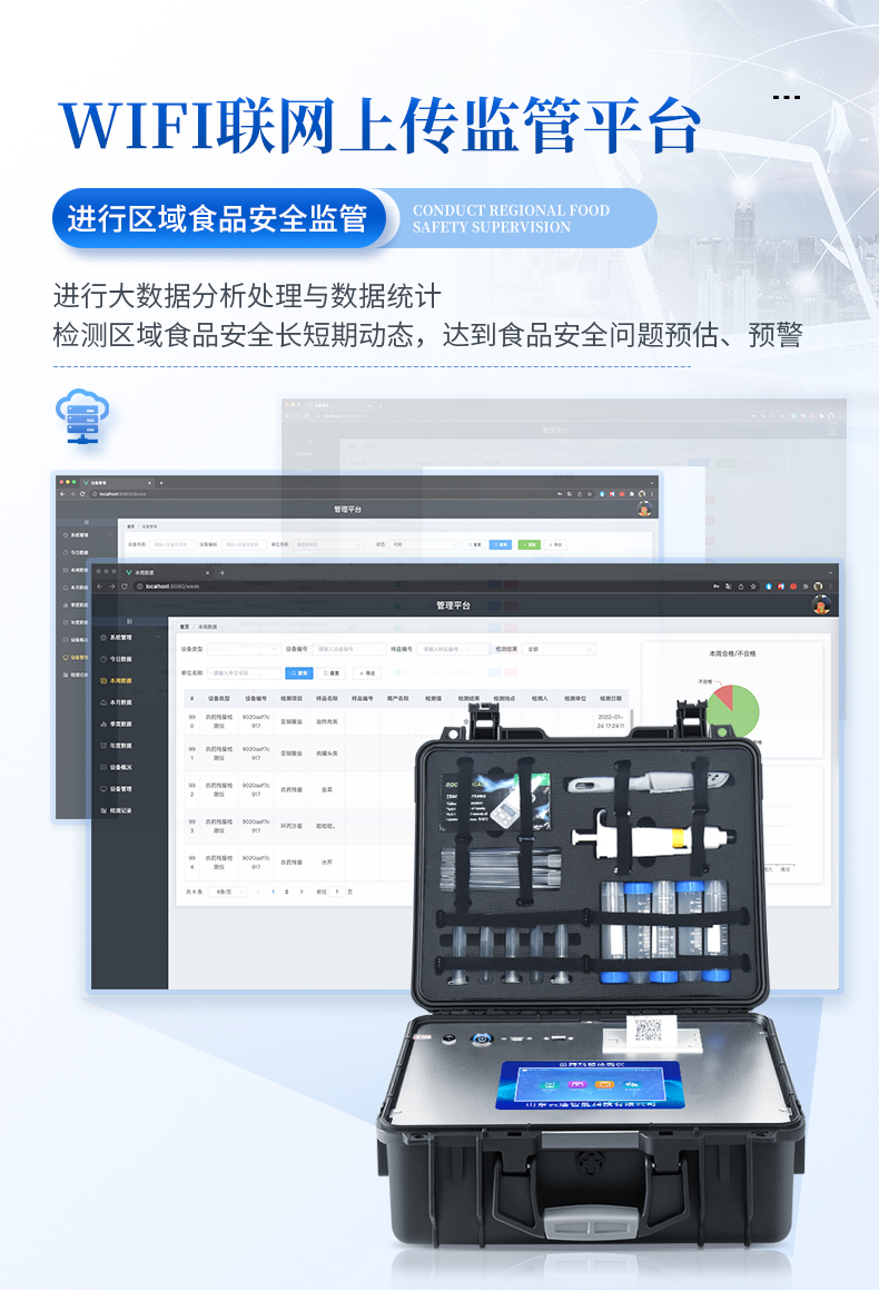 4、儀器帶有監管平臺。數據可局域網和互聯網數據上傳,檢測結果直接傳至食品安全監管平臺。進行區域食品安全監管及大數據分析處理與數據統計,檢測區域食品安全長短期動態,達到食品安全問題預估、預警。