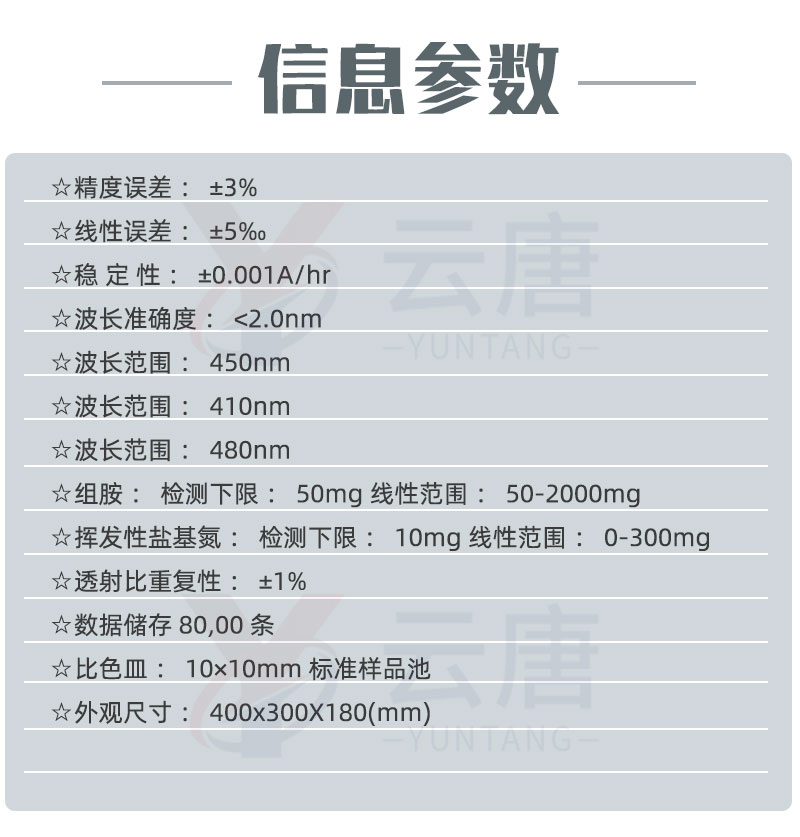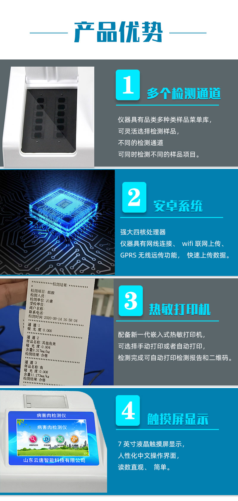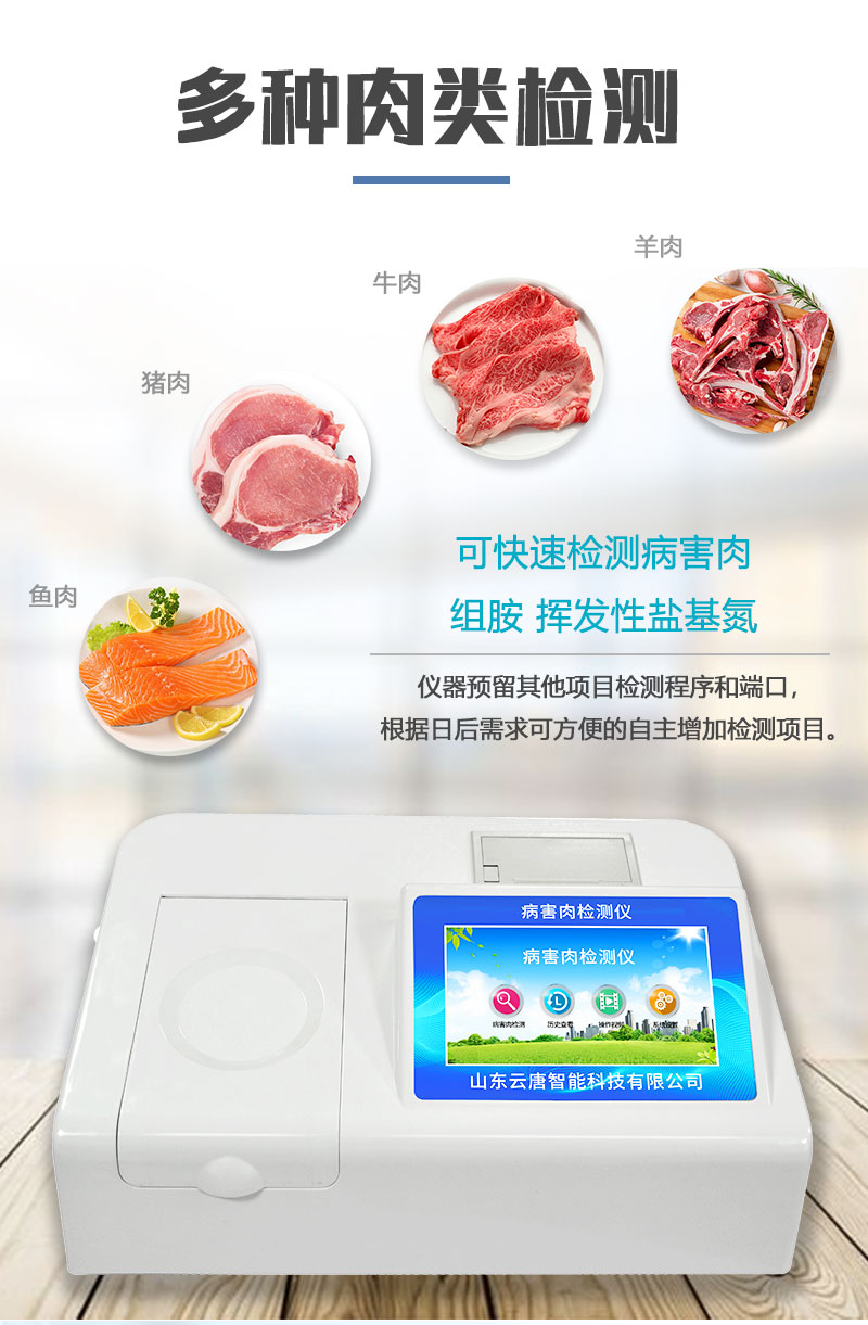 可快速檢測病害肉、組胺、揮發(fā)性鹽基氮,儀器預留其他項目檢測程序和端口,根據(jù)日后需求可方便的自主增加檢測項目。