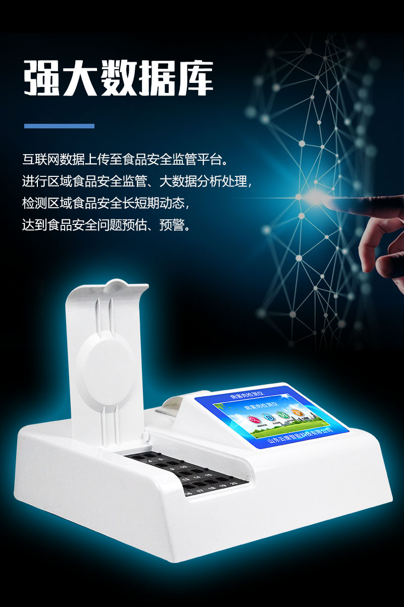 8、儀器帶有監(jiān)管平臺。數(shù)據(jù)可局域網(wǎng)和互聯(lián)網(wǎng)數(shù)據(jù)上傳,檢測結(jié)果直接傳至食品安全監(jiān)管平臺。進行區(qū)域食品安全監(jiān)管及大數(shù)據(jù)分析處理,檢測區(qū)域食品安全長短期動態(tài),達到食品安全問題預估、預警