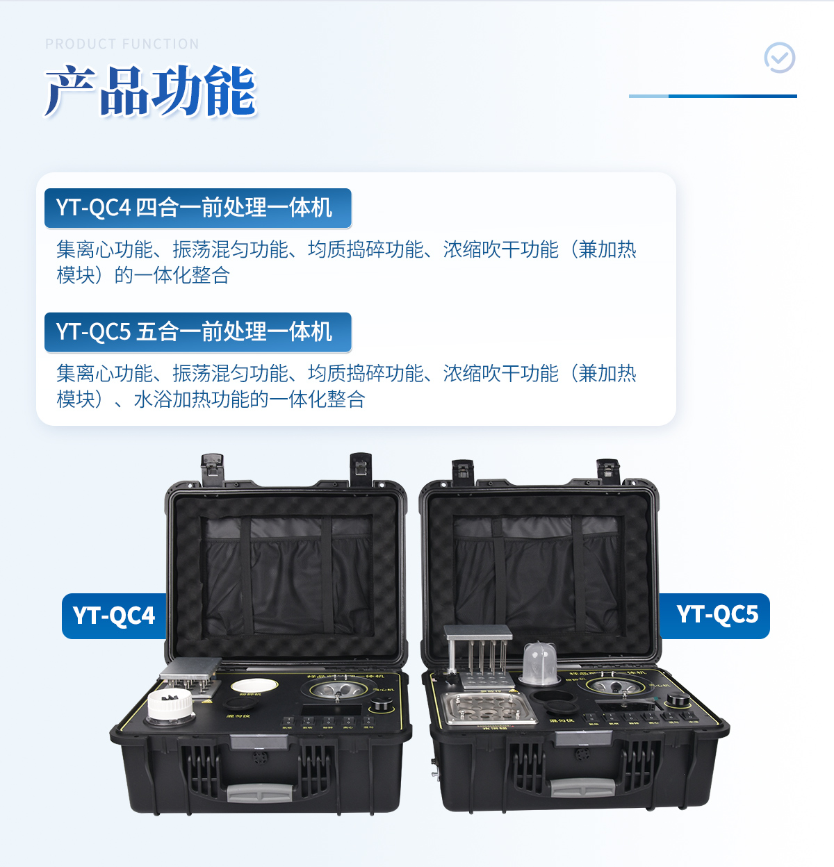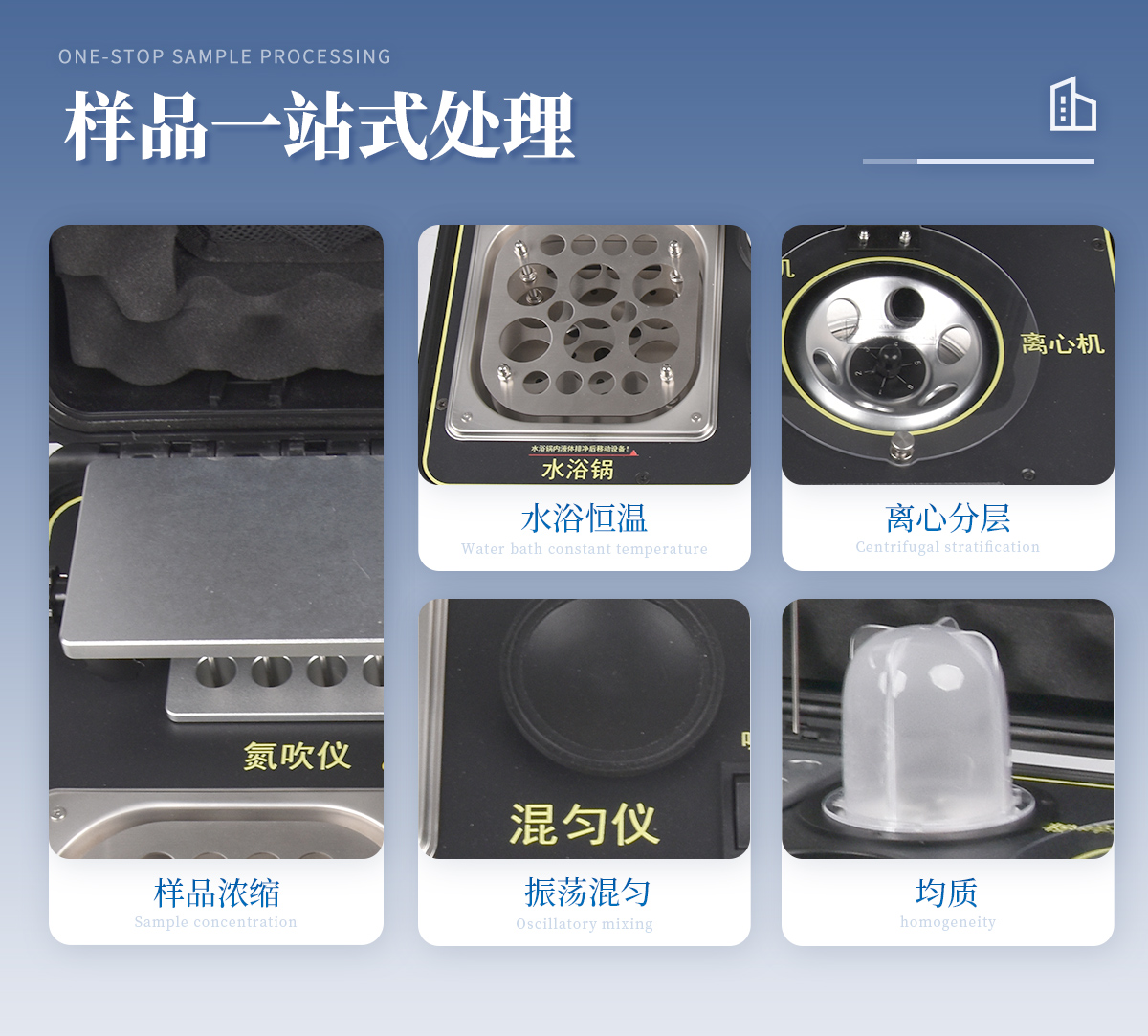 QC4型四合一樣品檢測前處理一體機(箱)是集吹干、離心、均質、混勻功能的一體化整合,極大的簡化和集中樣品前處理的一般操作過程,結合移動便攜的工程塑料箱體,特別適合農獸藥殘留畜禽水產品質量安全現場快速檢測。