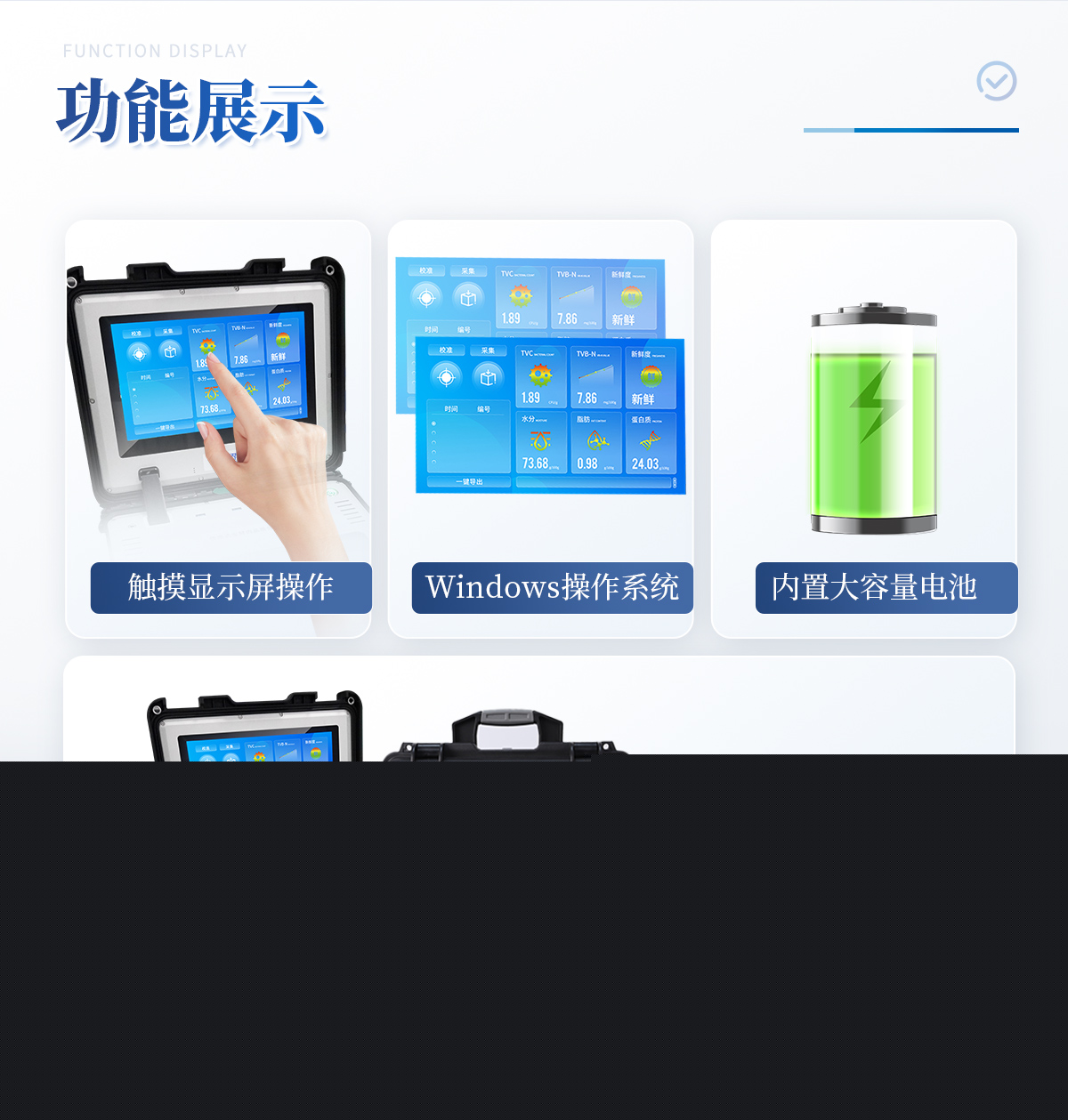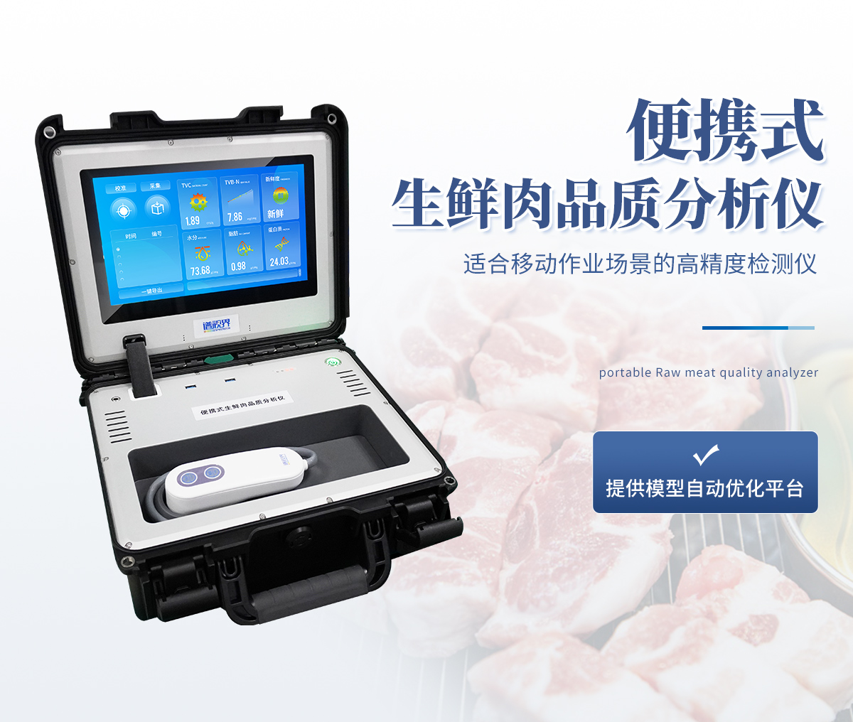 可用于檢測(cè)生鮮肉的蛋白質(zhì)、脂肪、水分、pH、TVC、TVB-N、新鮮度、L*、A*、B*等品質(zhì)參數(shù)。配備手提箱式防水減震外殼、大尺寸觸控屏幕并內(nèi)置大容量電池,可一鍵自動(dòng)校準(zhǔn),是一款適合移動(dòng)作業(yè)場(chǎng)景的高精度生鮮肉品質(zhì)檢測(cè)儀,其可用于生鮮肉及肉品生產(chǎn)、加工、儲(chǔ)運(yùn)企業(yè)、肉品品質(zhì)監(jiān)管部門(mén)等。